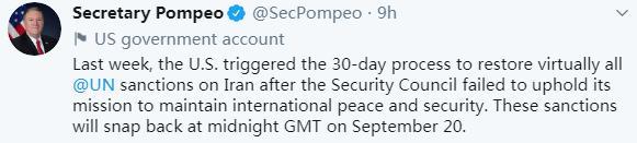 蓬佩奥8月27日在社交网站上写道:“上周,安理会未能维持其维护和平与安全的使命之后,美国启动了一个为期30天的进程,以恢复几乎所有联合国对伊朗的制裁。这些制裁将于格林威治时间9月20日零时恢复。”