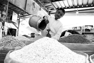 也门是世界上粮食危机最严重的国家之一,约两千万人面临粮食供应短缺。图为在也门萨那,一名商贩在售卖谷物。 新华社发(穆罕默德摄)