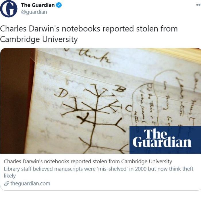 中新网11月25日电 综合报道,英国剑桥大学图书馆24日表示,英国生物学家、进化论创立者达尔文的两本珍贵笔记本,据信遭窃。笔记本2001年就曾被列为遗失,但馆方认为其只是被错放在了馆内某处。据介绍,笔记本内有关于进化论的开创性想法,价值不菲。