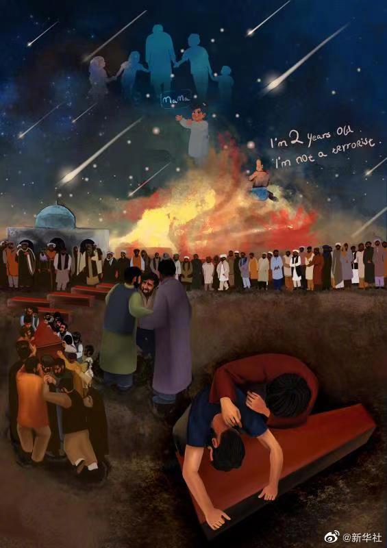 赵立坚介绍,8月29日,美军发动空袭炸毁阿富汗首都喀布尔的一处民宅,炸死了一家十口,包括七个孩子。事后美军只是发表声明:将会评估空袭造成的平民伤亡。玛丽卡和苏玛雅只有两岁,在空袭中被炸身亡,这幅漫画因此取名《两岁“恐怖分子”的葬礼》。漫画描述的是七个夭折的孩子下葬的瞬间。