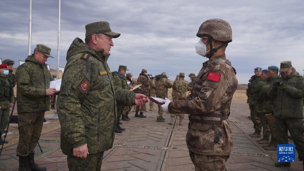 9月24日,在俄罗斯奥伦堡州东古兹靶场举行的“和平使命-2021”上海合作组织联合反恐军事演习闭幕式上,中方参演部队官兵代表接受奖章。新华社记者梅世雄摄