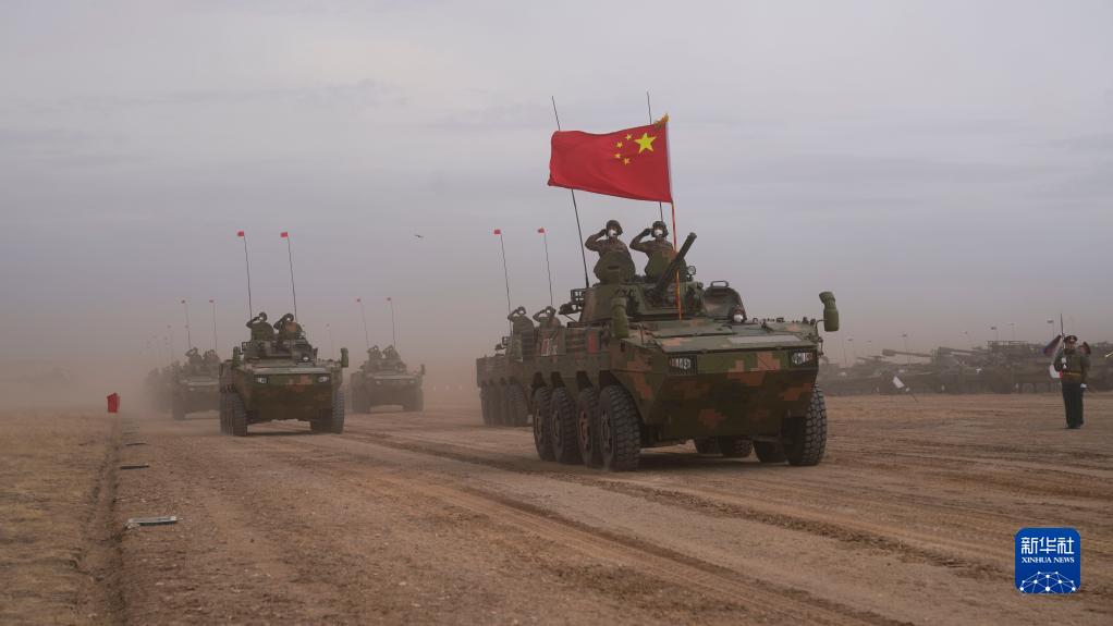 9月24日,在俄罗斯奥伦堡州东古兹靶场举行的“和平使命-2021”上海合作组织联合反恐军事演习闭幕式上,中方参演部队方队接受检阅。新华社记者梅世雄摄