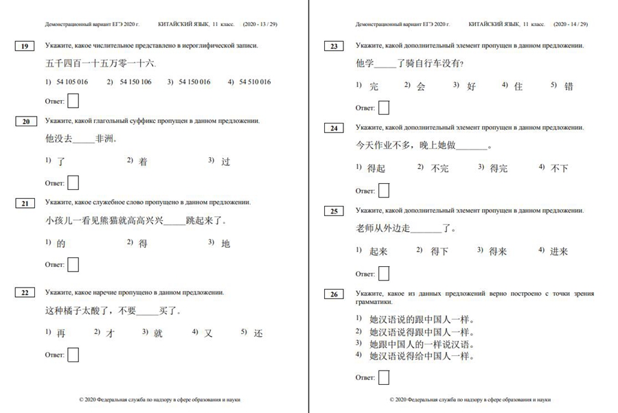俄罗斯国家统一考试汉语科目考试的部分模拟试题