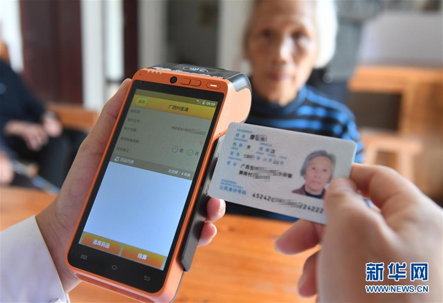 在广西贺州市平桂区狮南村卫生室,医生用“村医通”系统刷病人身份证进行医疗费用结算(2019年11月13日摄)。新华社记者 陆波岸 摄