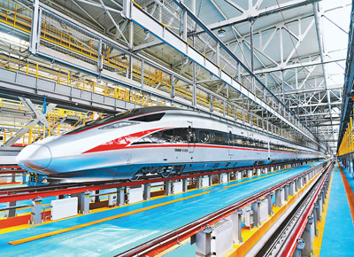 1月6日,我国新型时速350公里复兴号高寒动车组首次在中国铁路北京局集团有限公司北京动车段朝阳动车运用所亮相。该动车组采用了铬钼合金钢螺栓螺母、自动化防冻结功能制动、覆盖防寒材料的供排水管等技术、设备,可适应零下40摄氏度的运行环境。目前,这组动车进入运行试验阶段,有望在我国高寒地区京哈高铁上线运营。图为1月6日拍摄的新型时速350公里复兴号高寒动车组。新华社记者 陈钟昊摄