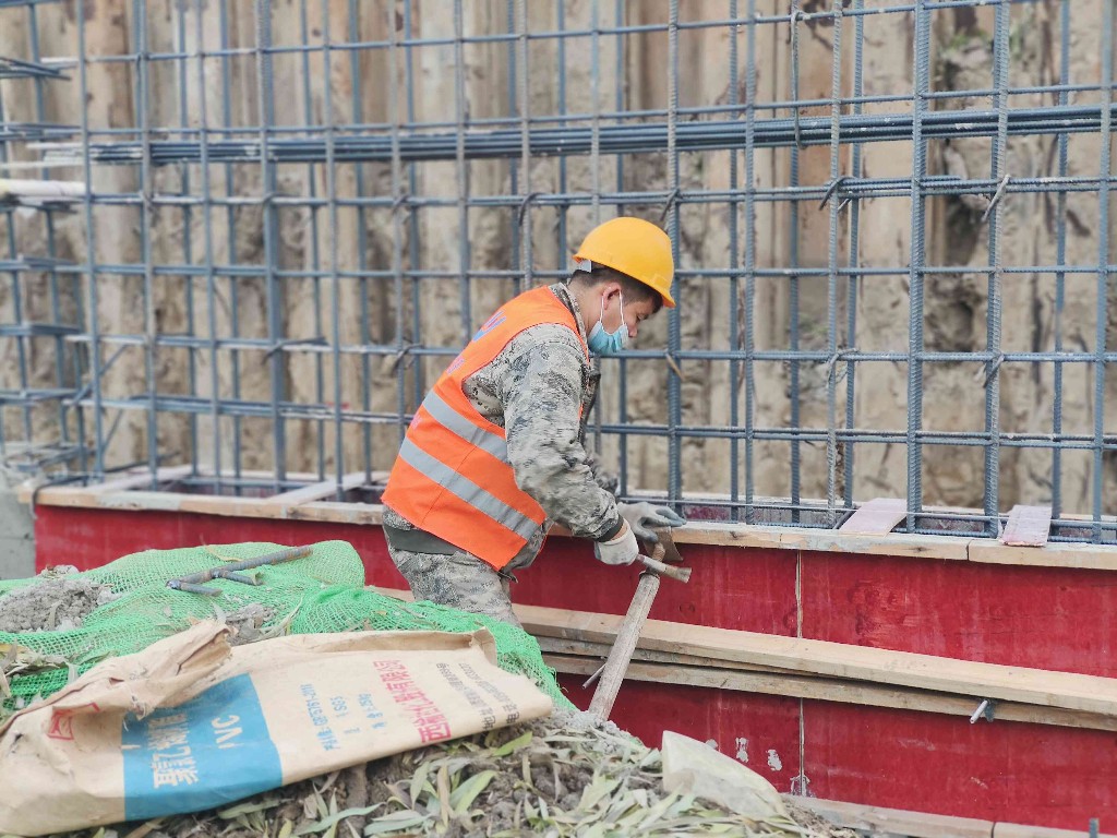 环城水系二期府河妇幼保健院段,施工人员正在修建新的挡土墙。