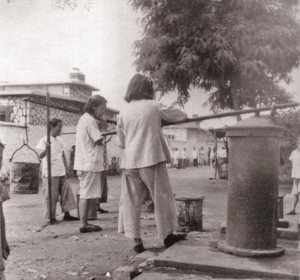 解放初期,居民排队用压水井取水(资料片)