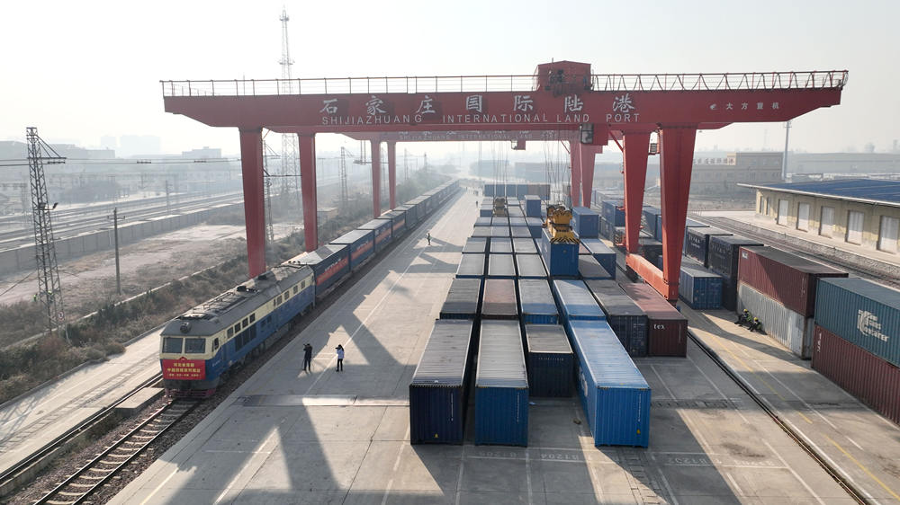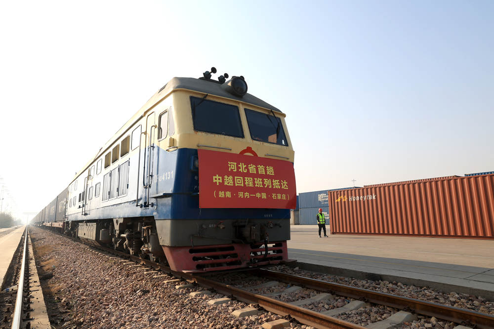 河北省首趟中越回程班列抵达石家庄国际陆港。