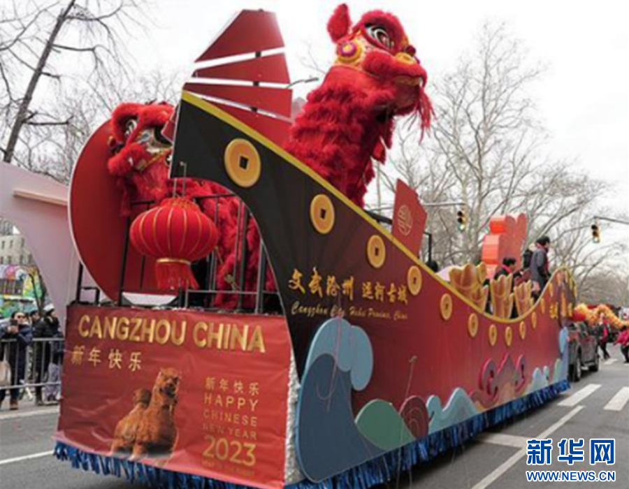 “真没想到还有这么美丽的花车,它就像一艘扬帆起航的轮船。”在美国纽约时间2023年2月12日举行的纽约新春大游行文化节上,“文武沧州,运河古城”主题花车作为头车带领古运河文化“扬帆出海”。大运河、铁狮子、舞狮等沧州文化元素引得海外观众频频喝彩并按下快门键。