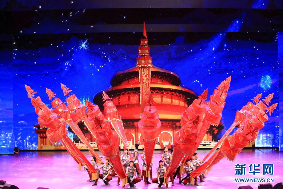 沧州杂技演员表演荣获中国杂技金菊奖的杂技节目《龙跃神州——中幡》。