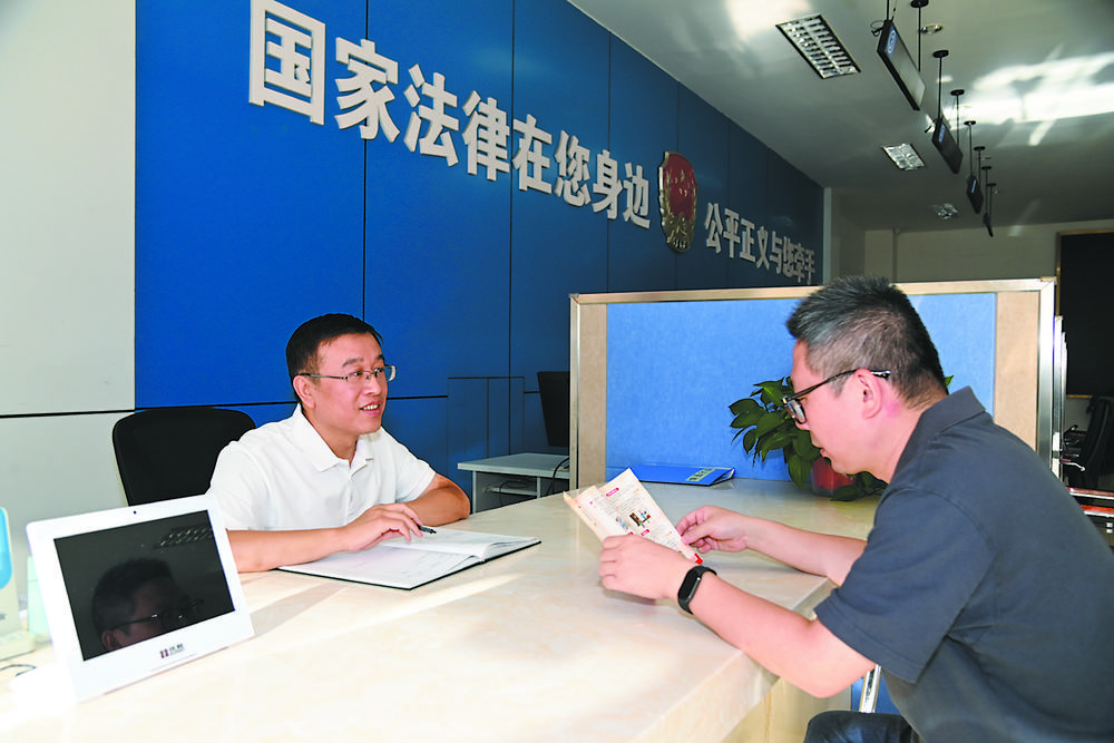 在石家庄市公共法律服务中心办事大厅,工作人员为前来咨询的市民提供法律建议和解决方案。