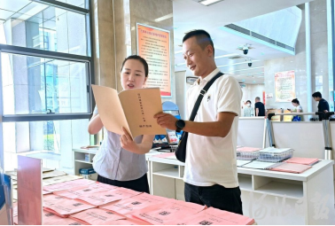 7月19日上午,廊坊市安次区行政审批局工作人员杨晴(左)为马超讲解“信用修复高效办成一件事”相关流程。