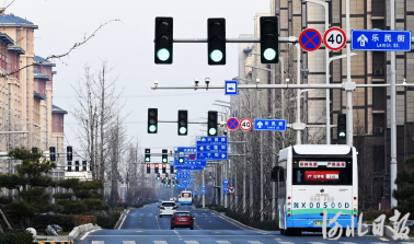 12月9日,雄安新区容东片区乐民街上,车辆在绿波路段顺畅通行。