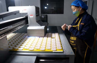 在宁晋县百花烛业有限公司印刷车间内,打印机正在给蜡烛打印上色。