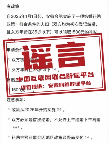 真相:近日,有网民发布消息称“自2025年1月1日起,安徽合肥实施结婚补贴政策”“初次结婚登记可以领取1500元补贴”“下载相关APP即可领补贴款”,引发关注。对此,合肥市民政局发布声明称,网传消息为谣言。合肥市并未研究、出台有关结婚登记的补贴政策,望广大网民注意甄别。(来源:“安徽省互联网违法和不良信息举报”微信公众号)