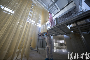 12月5日,邱县南街村邯郸向冬食品有限公司风干车间,制面师傅李连兴(下)与工友一起将挂面上架。