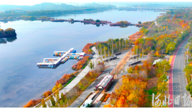 11月15日,石家庄市滹沱河畔,红橙黄绿多色树叶交错,绘出一幅层林尽染的美丽生态画卷。