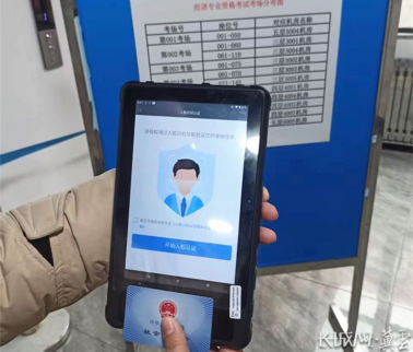 工作人员在经济专业技术资格考试考场对考生进行身份核验。