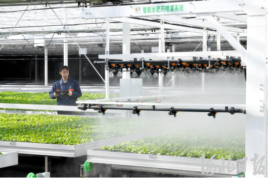 12月7日,在饶阳县河北致信数字育苗育种产业园日光温室大棚里,工人操作设备为蔬菜苗浇水。