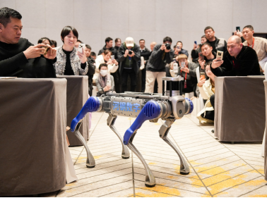 12月12日,在雄安新区智能机器人产业发展大会现场,河钢数字旗下的智能巡检四足机器狗正在进行表演。