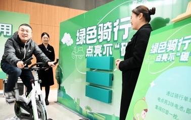 12月12日,“废旧3C电子产品回收进地方机关系列活动”首场活动在雄安新区启动。图为雄安新区党政机关干部职工正在低碳生活体验专区参加“绿色骑行”活动。