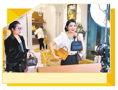 工作人员通过直播销售女士背包。