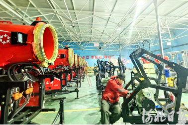 11月25日上午,宣化区冰雪产业园。记者走进张家口卡宾滑雪装备制造有限公司装备车间,里面一派繁忙景象。偌大的车间内,一排排红色造雪机排列整齐,工人们正在紧锣密鼓组装造雪机。