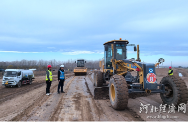 在雄安新区新盖房分洪道右堤堤防加固和治理工程(二期)项目现场,平地机、压路机联合施工。