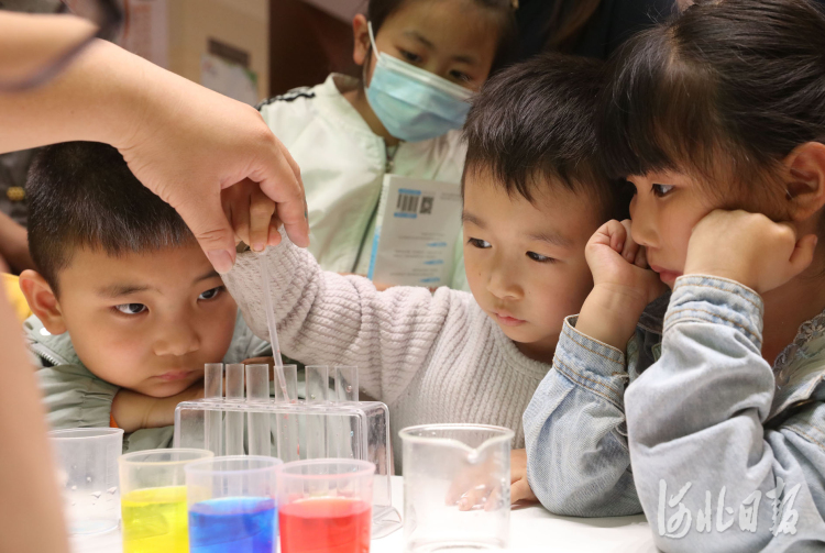 2021年5月30日,小朋友们在河北省邯郸市邯郸书城开设的科学小课堂中自己动手做实验。通讯员杨扬摄影报道