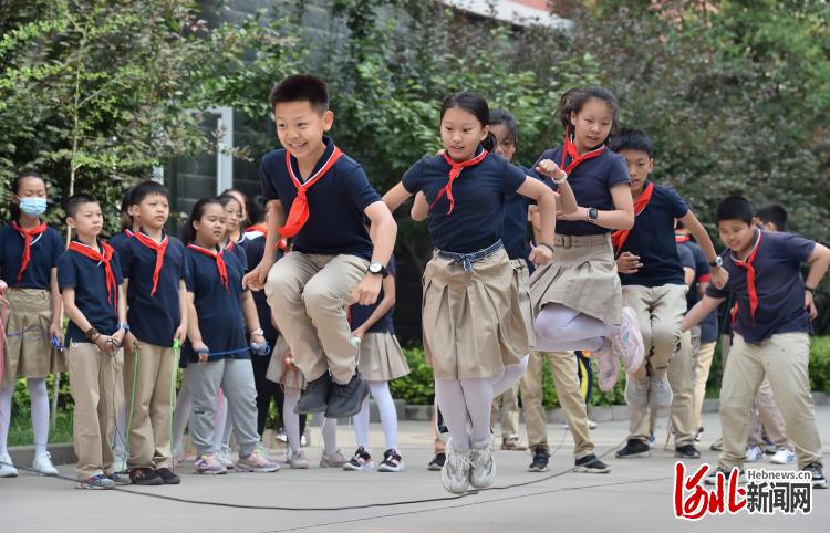 2021年5月31日, 石家庄市仁华小学的学生们在课间进行跳绳游戏。为了提升学生体质、丰富校园生活,仁华小学开设了跳绳、韵律操、太极拳等丰富多彩的大课间活动。 通讯员 张晓峰 摄影报道