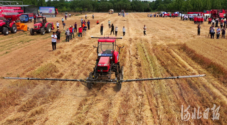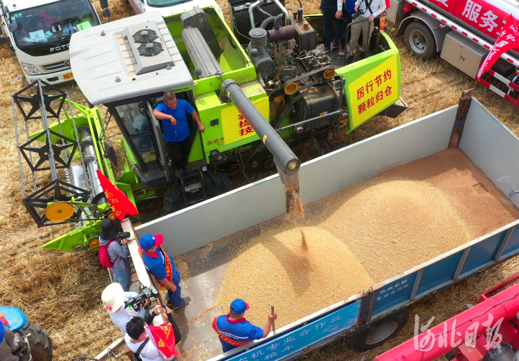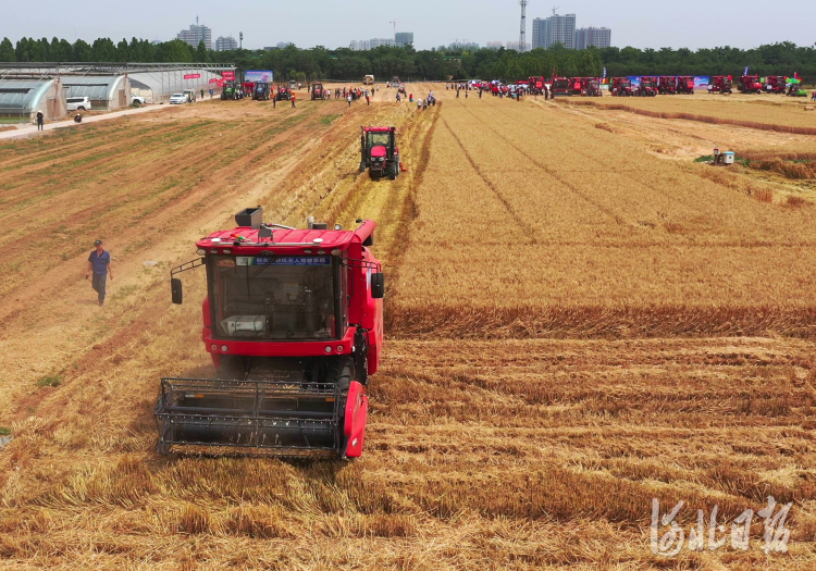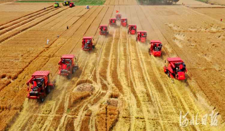2021年6月7日,随着十几台大型小麦联合收割机驶入河北省成安县成安镇南鱼口村俊山农机服务专业合作社的麦田,河北省小麦机收作业拉开序幕。今年,河北省冬小麦播种面积为3350.5万亩,其中3340万亩适宜机收。河北日报记者 田瑞夫 摄影报道