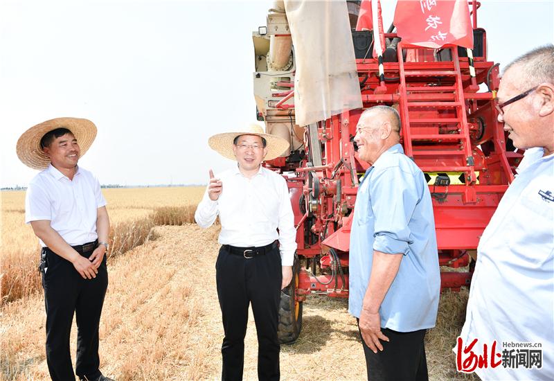 六月的冀南原野,麦浪翻滚,丰收在望。王东峰来到衡水市景县龙华镇彭村,实地察看志清农民专业合作社麦收情况。该合作社由200余名农民群众组建而成,流转土地3000多亩,繁育和种植优质小麦品种,是重要的小麦生产基地。王东峰认真听取工作汇报,走进麦田查看小麦长势,与农业专家、种粮大户和农机手随机交流,并登上联合收割机,详细了解小麦机收情况。种粮群众介绍说,今年夏粮丰收在望,预计单产增产20%左右,收购价格比较稳定,乡亲们感谢党的好政策,日子越过越红火。王东峰听后非常高兴,祝愿乡亲们年年都有好收成,生活越来越幸福。他强调,我省是小麦种植大省,承担着保障国家粮食安全的重大政治责任。要坚持政治站位,强化大局观念,严格落实党中央、国务院对粮食核心产区的部署要求,确保粮食种植面积稳定、结构合理、品质优良,牢牢把握粮食安全主动权。当前,“三夏”在即,要及时科学做好气象预测预报工作,组织广大群众全力开展抢收抢种,确保小麦及时收割和晾晒,按照政策组织好夏粮收购,严防压级压价,切实增加粮食储备。要强化农业科技创新,积极研发和推广节水、高产粮食品种,加大对群众技术指导力度,不断减少地下水开采,提高粮食品质和产量。要大力发展农民专业合作社和家庭农场,有序推进农业规模经营,不断提升抗风险能力,促进农业增产、农民增收。