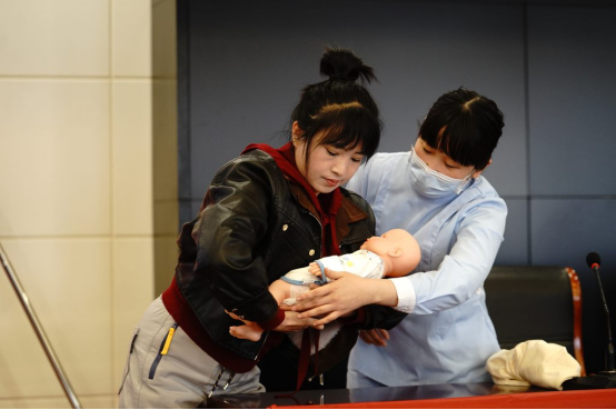 3月14日,邢台经济开发区后楼下社区,学员在教师指导下学习母婴护理知识。