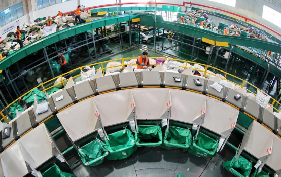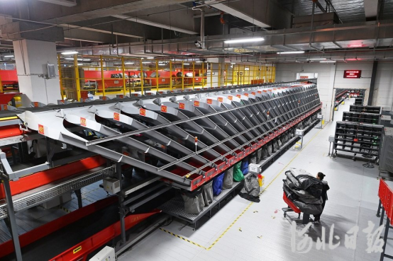 在顺丰速运华北分拨区廊坊开发区中转场,全自动分拣线高速运转。