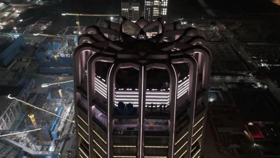 ▲中化大厦的16根高低错落的八棱形柱子,都采用了容西混凝土公司独家供应的自密实混凝土,极大满足了技术要求,也保障了工程质量。