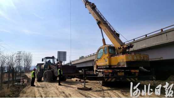 3月14日,在荣乌高速沧州段改扩建项目南排河大桥施工现场,大型机械正在作业。