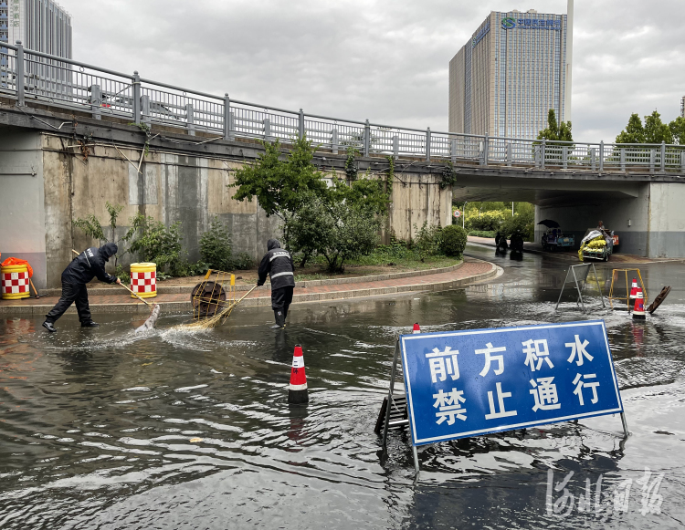2021年7月11日,石家庄裕华区城管局工作人员在石家庄市裕华路与东二环桥下清理积水。河北日报记者史晟全摄影报道