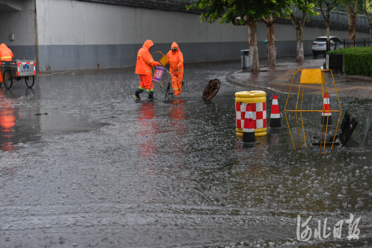 2021年7月11日,石家庄裕华区城管局工作人员在石家庄市裕华路与东二环桥下冒雨清理积水。河北日报记者史晟全摄影报道