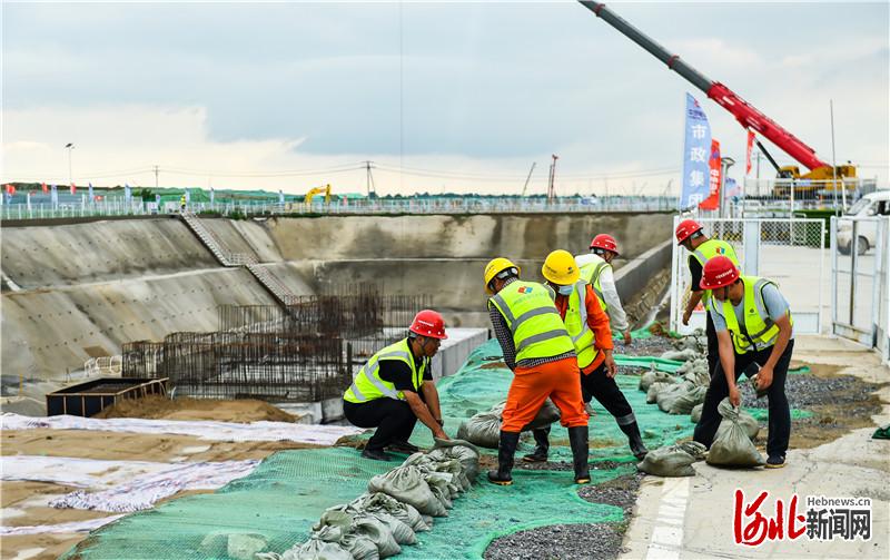 7月12日,施工人员在雄安新区启动区放置沙袋。 河北日报记者 耿辉摄