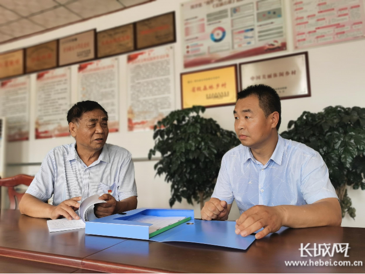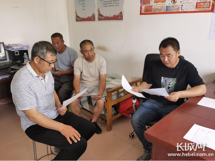 魏晓帅(右一)和部分村干部在研究坑塘治理工作。长城网记者 郭庆敏 摄