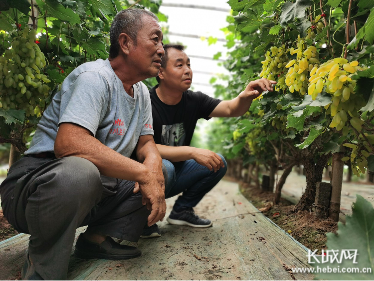 魏文宗(左)和魏晓帅在地里观察葡萄长势。长城网记者 郭庆敏 摄