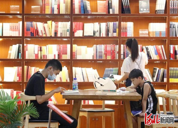 2021年7月15日,河北省石家庄市一家休闲主题书店,两位小读者在认真阅读。通讯员梁子栋摄影报道