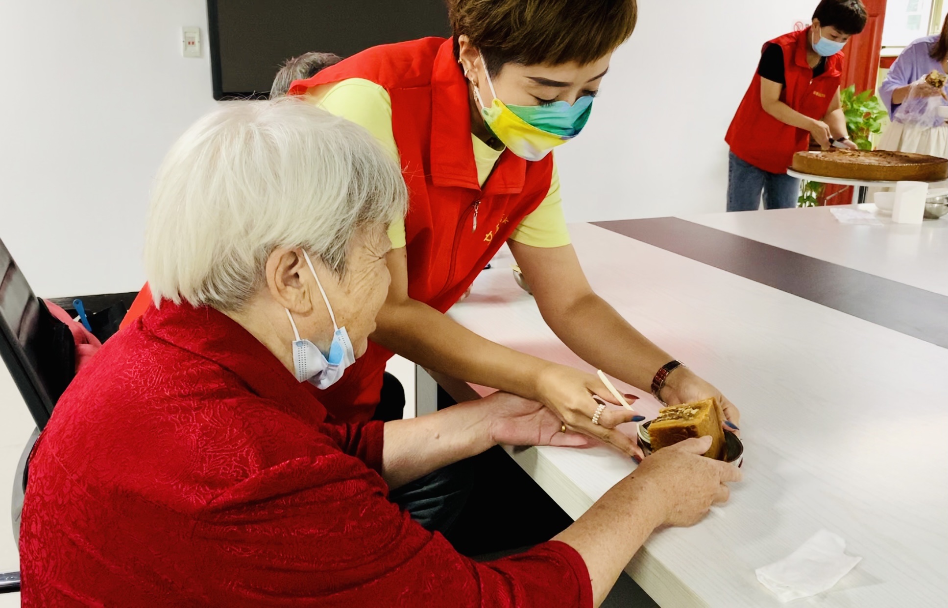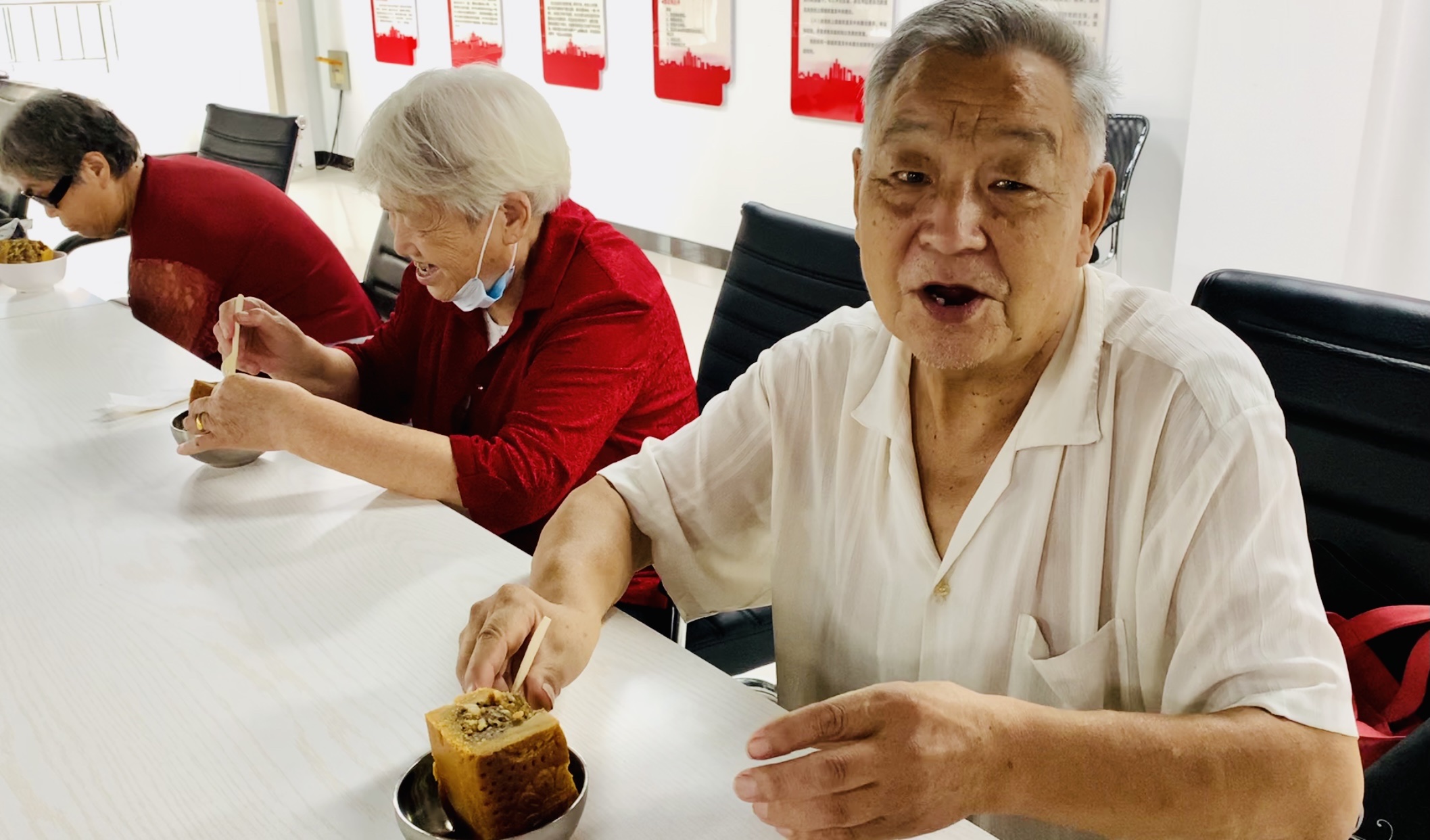 起初并不太熟悉的老人们,因为月饼,大家有了共同语言,不一会儿就互相聊了起来。有老人感慨,现在生活水平越来越高,过节方式也多了,但他还是更喜欢热闹又有传统味道的过节氛围,这次在与同龄人一起过节中,又一次感受到了。