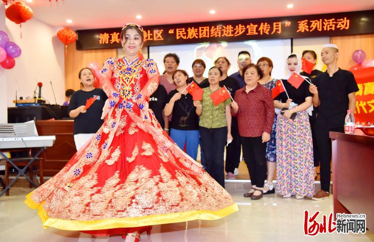 2021年9月17日,河北省石家庄市新华区清真寺街社区活动中心,社区的少数民族居民为大家表演民族舞。当日,石家庄市民宗局在该市新华区清真寺街社区开展“中华民族一家亲 同心共筑中国梦”社区各族居民迎中秋活动。活动现场,社区工作人员为辖区居民发放宣传册宣讲民族政策,举办丰富多彩的文艺演出,共建和谐社区。 通讯员 张晓峰 摄影报道