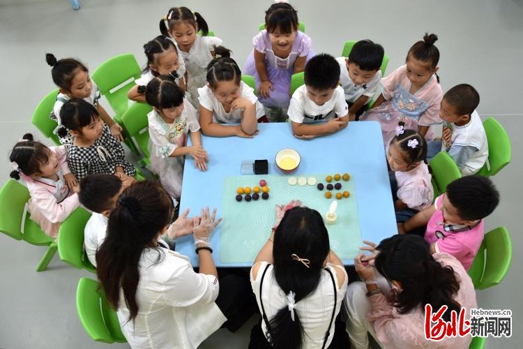 2021年9月17日,河北省唐山市丰润区冀新乐贝幼儿园里,孩子们在烘焙老师的指导下学习月饼制作,感受传统文化魅力,喜迎中秋佳节。 通讯员 齐磊 摄影报道