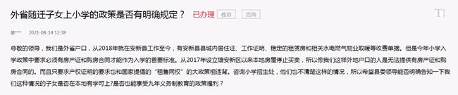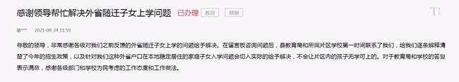 孩子入学问题解决后,网友“雄安新人”再次通过“领导留言板”表达了感谢之情:“尊敬的领导,非常感谢各级(部门)对我们之前反馈的外省随迁子女上学的问题给予解决。”他说,“在留言板咨询问题后,县教育局和所属片区学校第一时间联系了我们,给我们逐条解释清楚了今年的招生政策,以及针对我们这种外省户口在本地稳定居住的家庭子女入学问题会切入实际的给予解决,不会让片区内的孩子无学可上的。对于教育局和学校的答复表示满意,感谢各级部门和学校为民考虑的工作态度和工作做法。”