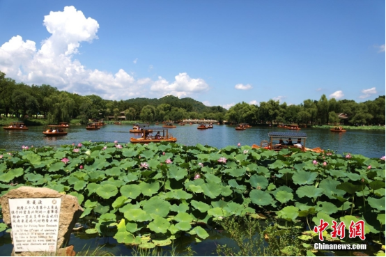 承德避暑山庄夏日湖区荷香浮动,吸引游人前来乘船赏花。