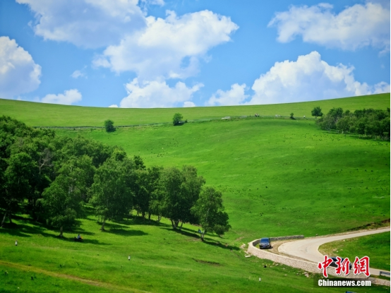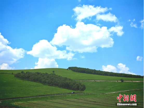 丰宁坝上草原夏季平均气温在20度左右,是天然的避暑胜地,吸引着众多游客前来游玩观光、感受草原风情。图为丰宁坝上草原夏季蓝天白云,洼水清澈,绿草茵茵。