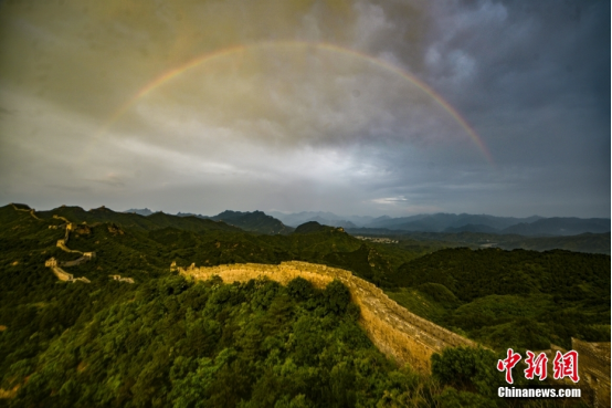 雨后初晴,河北省承德市滦平县金山岭长城上空,出现绚丽彩虹景象。