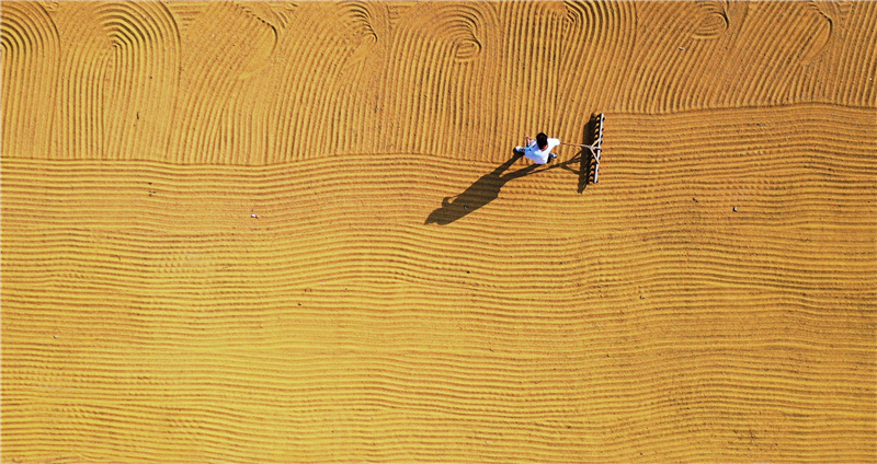 10月8日,在河北省石家庄市栾城区南高乡南高村,农户在晾晒谷子(无人机照片)。